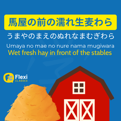 | Hiragana | うまやのまえのぬれなまむぎわら |