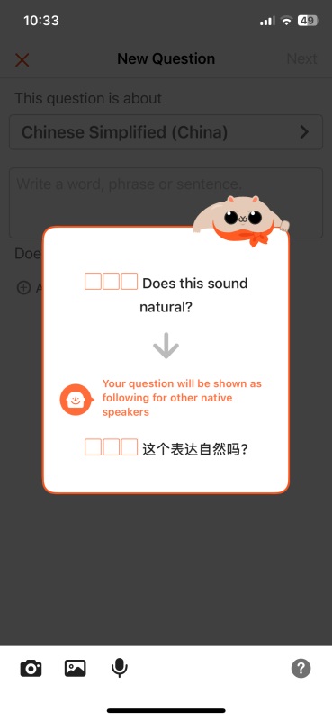 Use the pre-established question templates, ask for your pronunciation, a sentence to be corrected or for a quick translation, get suggestions from native speakers and so much more.